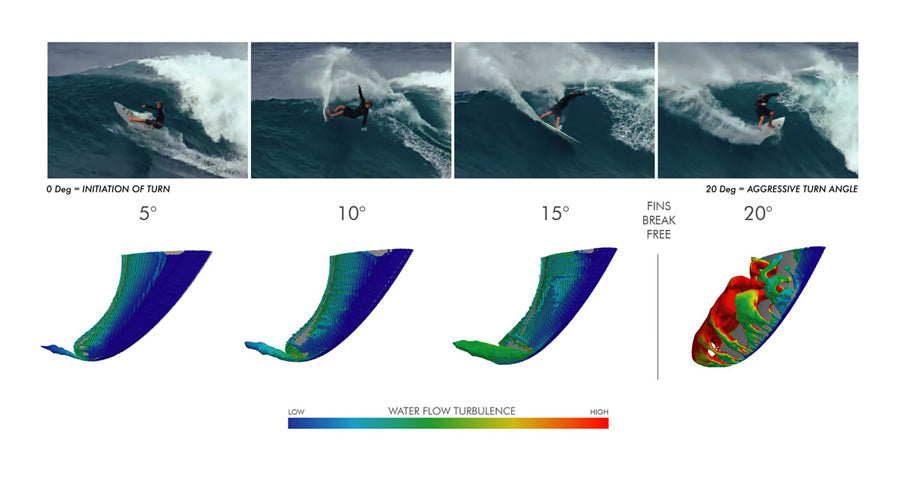 The more turbulent the water flow, the less efficient the fin is. This shows that when your fins break free and you slide out, you’re not able to generate any speed until your fins re-engage with the water. The angle at which your fins slide out has a lot to do with the template of the fin.
